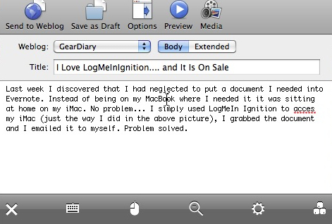 Last week I discovered that I had neglected to put a document I needed into Evernote. Instead of being on my MacBook where I needed it, it was sitting at home on my iMac. No problem… I simply used LogMeIn Ignition to access my iMac (just the way I did in … [visit site to ]